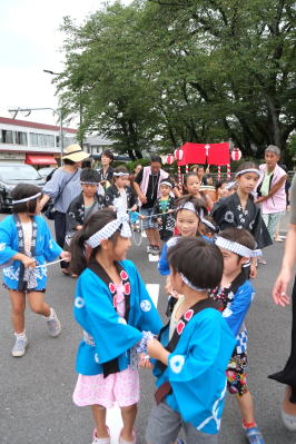 子ども揃いのハッピにねじり鉢巻き!記念撮影の後、神輿をかついで街に